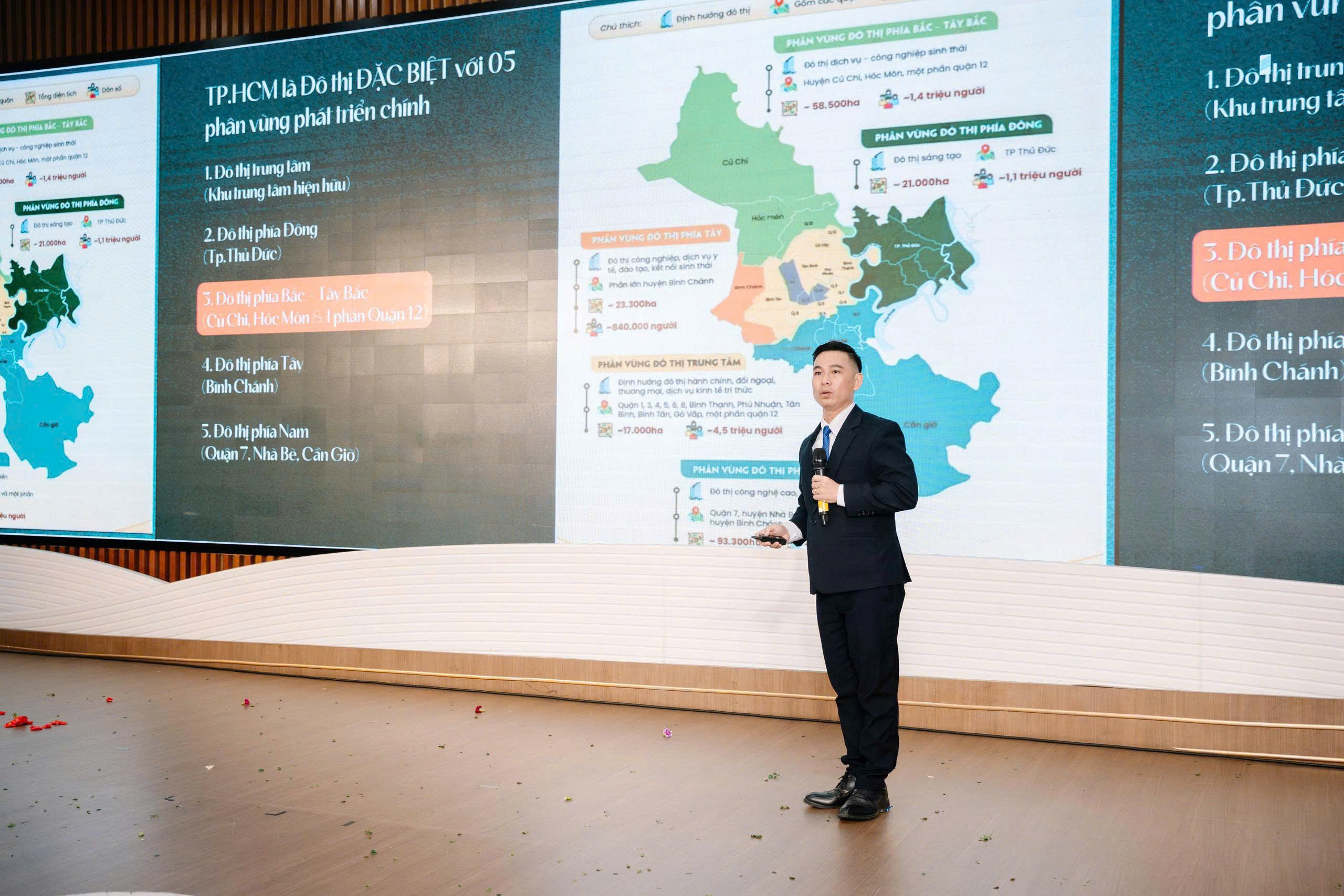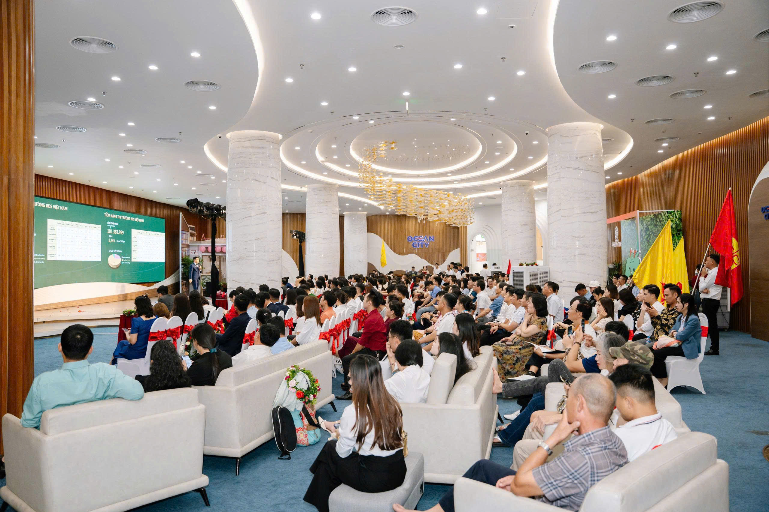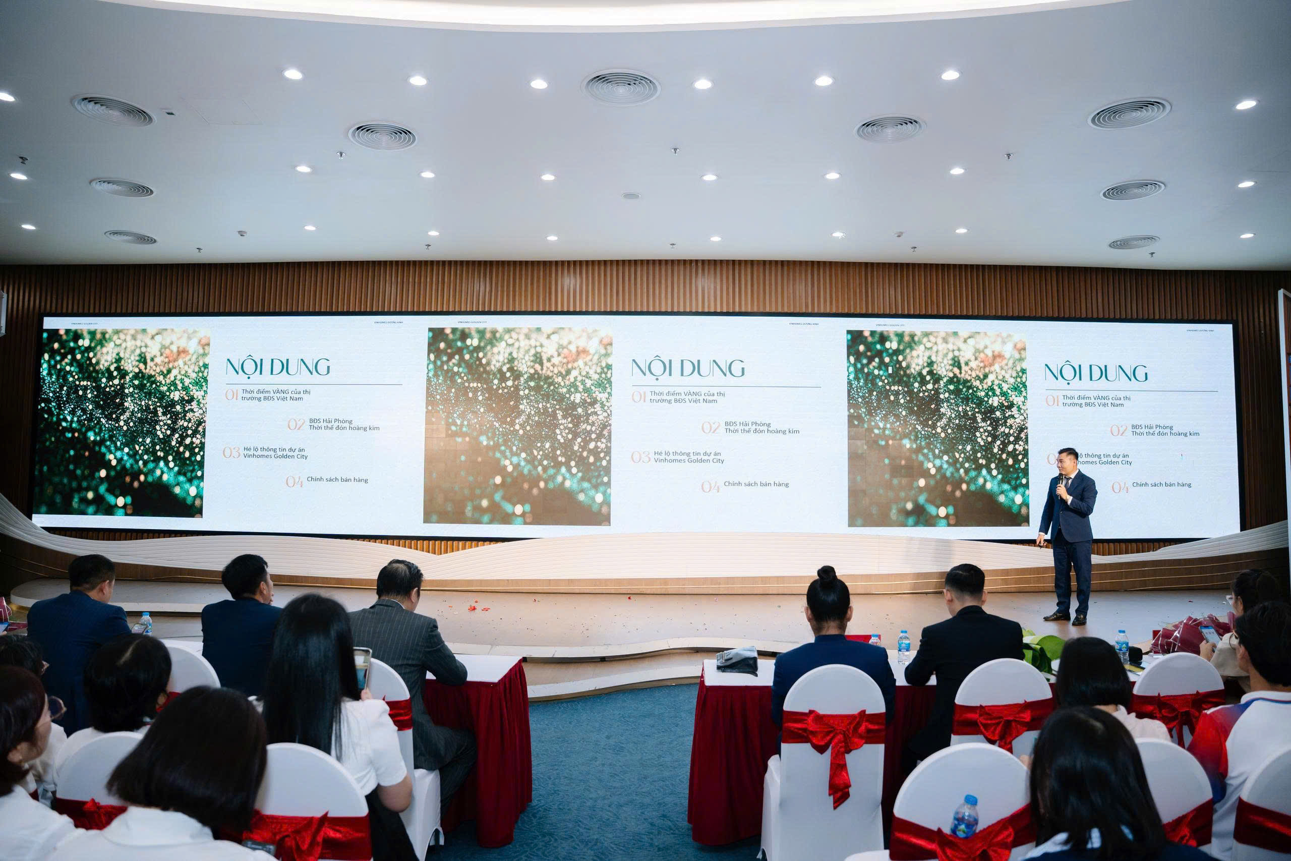Sau tiết mục văn nghệ mở màn bùng nổ “Nam Quốc Sơn Hà”, các chuyên viên và lãnh đạo đã xem video giới thiệu tổng thể về Vinhomes Green Paradise, cập nhật những thông tin quy hoạch, mục tiêu phát triển và định hướng sản phẩm.